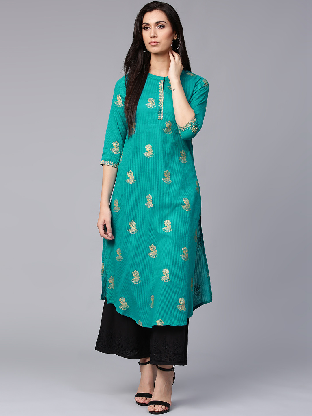 Rain & Rainbow Women Teal Green Printed A-Line Kurta